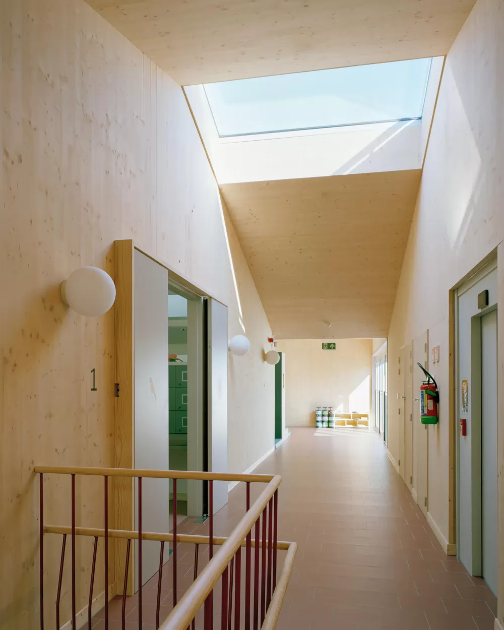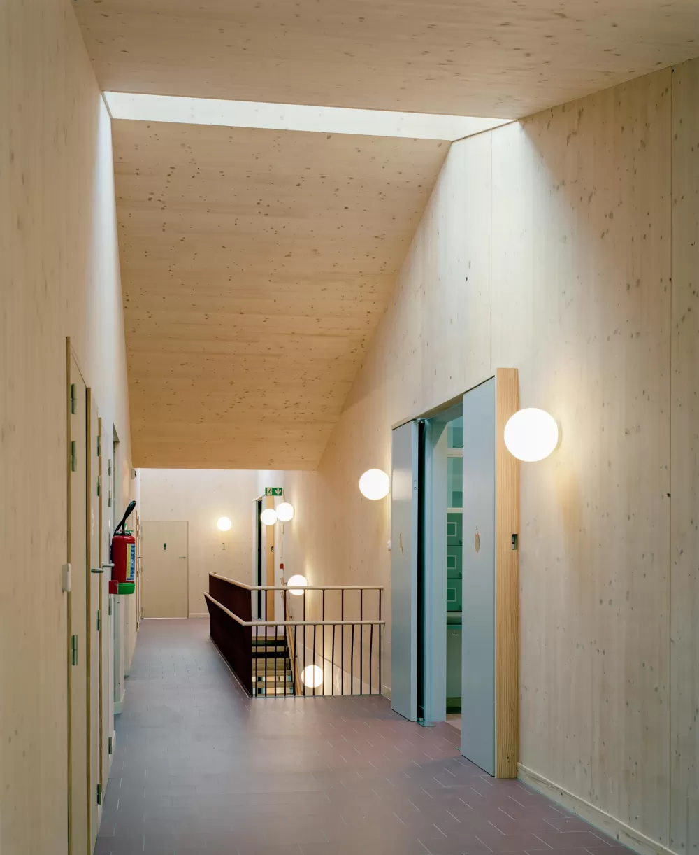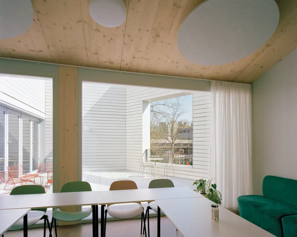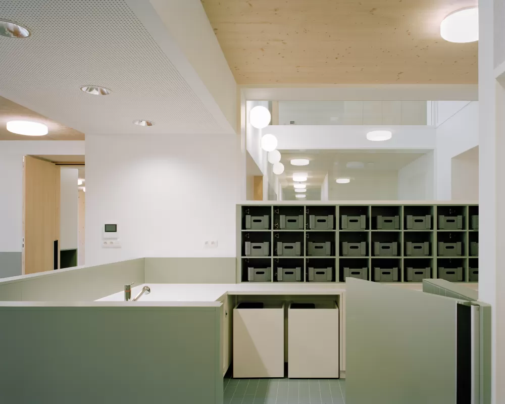 Het gebouw heeft een helder, rationeel en praktisch planschema afgestemd op de gebruikers: Eén centrale, oost-west gerichte binnenstraat scheidt op beide niveaus de noordelijk gelegen leefgroepen van de zuidelijk gelegen logistieke ruimtes. Alle leefgroepen zijn op gelijkwaardige wijze verbonden met één overzichtelijke buitenruimte en zijn ook intern met elkaar verbonden. Op beide niveaus verbreedt de binnenstraat telkens tot een polyvalente ruimte. Vides ter hoogte van de verschillende omkleedzones brengen in het gebouw voldoende daglicht en bieden visueel contact tussen beide niveau’s. Op het gelijkvloers is er centraal een duidelijke, gecontroleerde en transparante inkomzone met gescheiden in- en uitgang.
