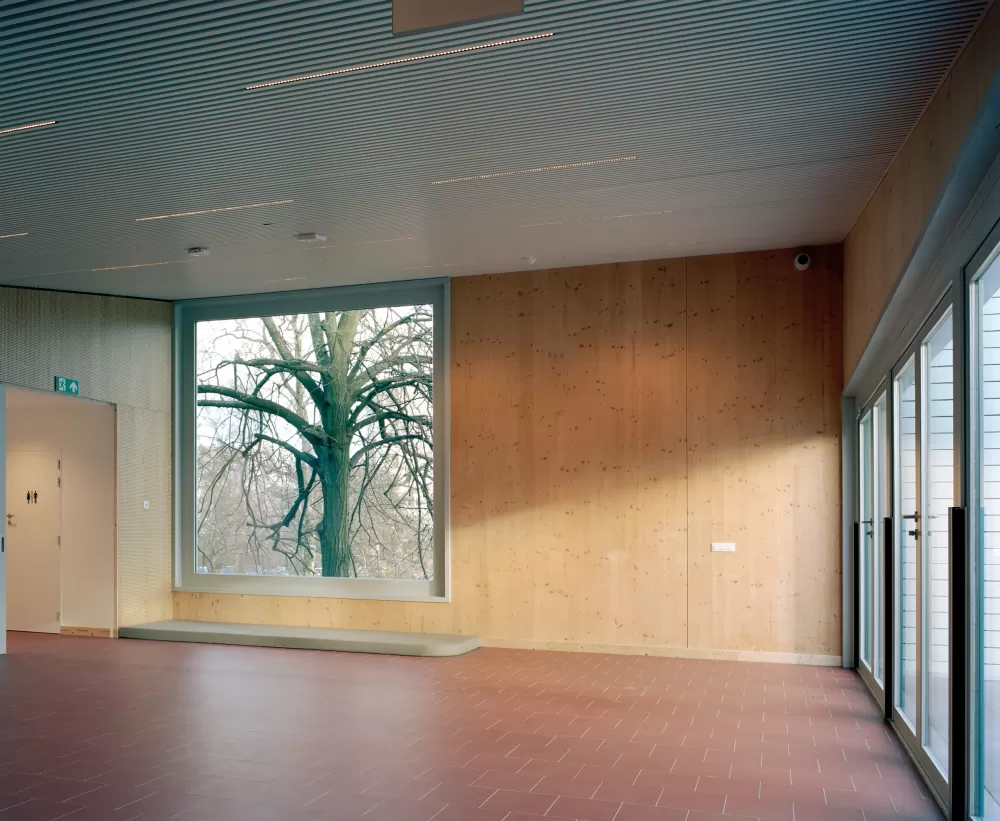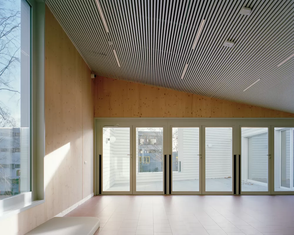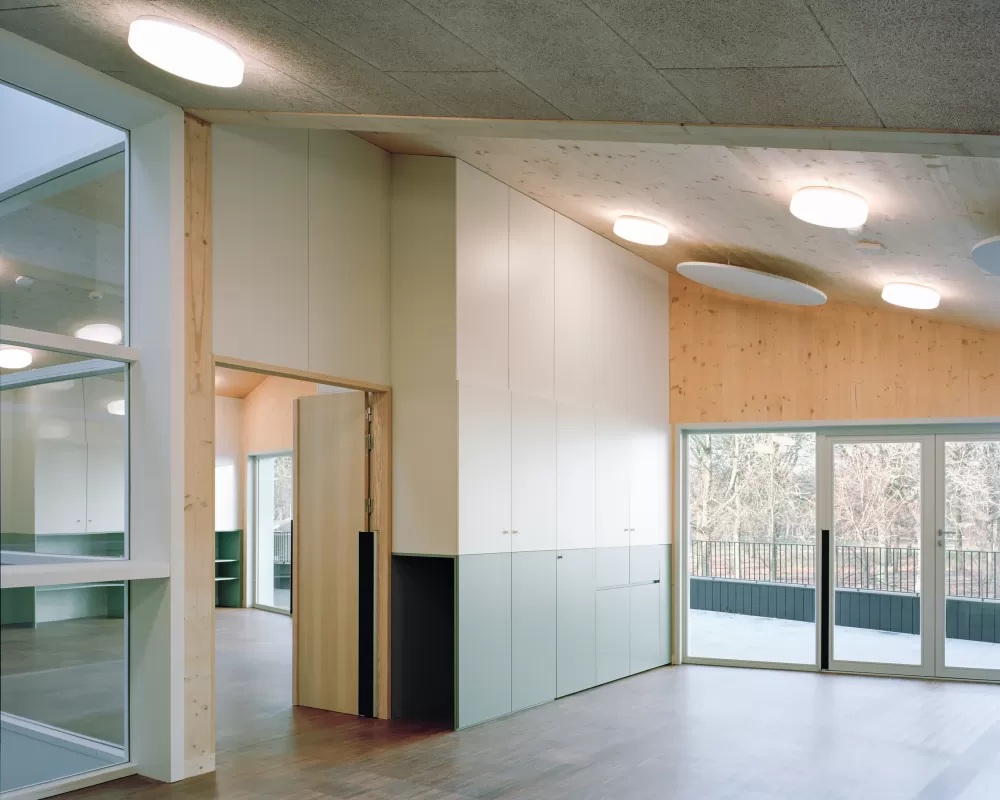 De footprint van het nieuwe gebouw is een veelhoek die het park omheen het gebouw geleidt. De buitenspeelruimte van het kinderdagverblijf is naar het hart van het park gericht en werd beperkt opgetild t.o.v.de parkomgeving. De naar de sportcluster georiënteerde zijde van het gebouw wordt ingericht als een overdekte buitenruimte,die ook gebruikt kan worden door de sportverenigingen.