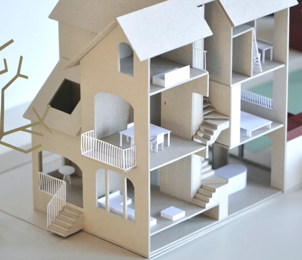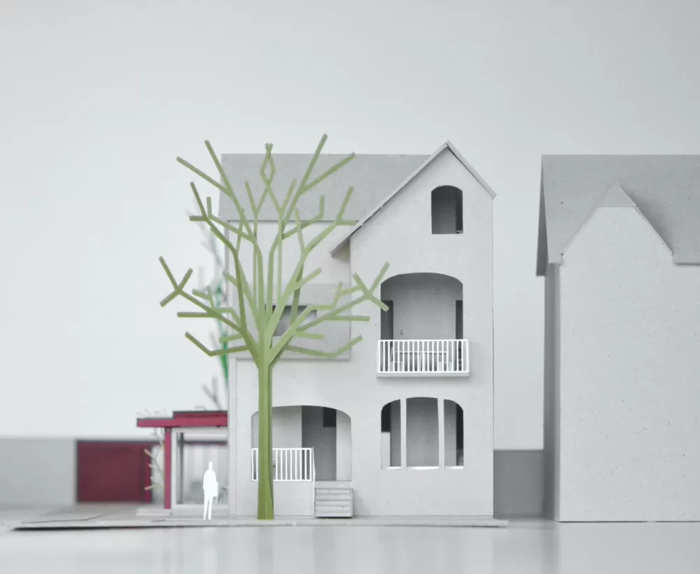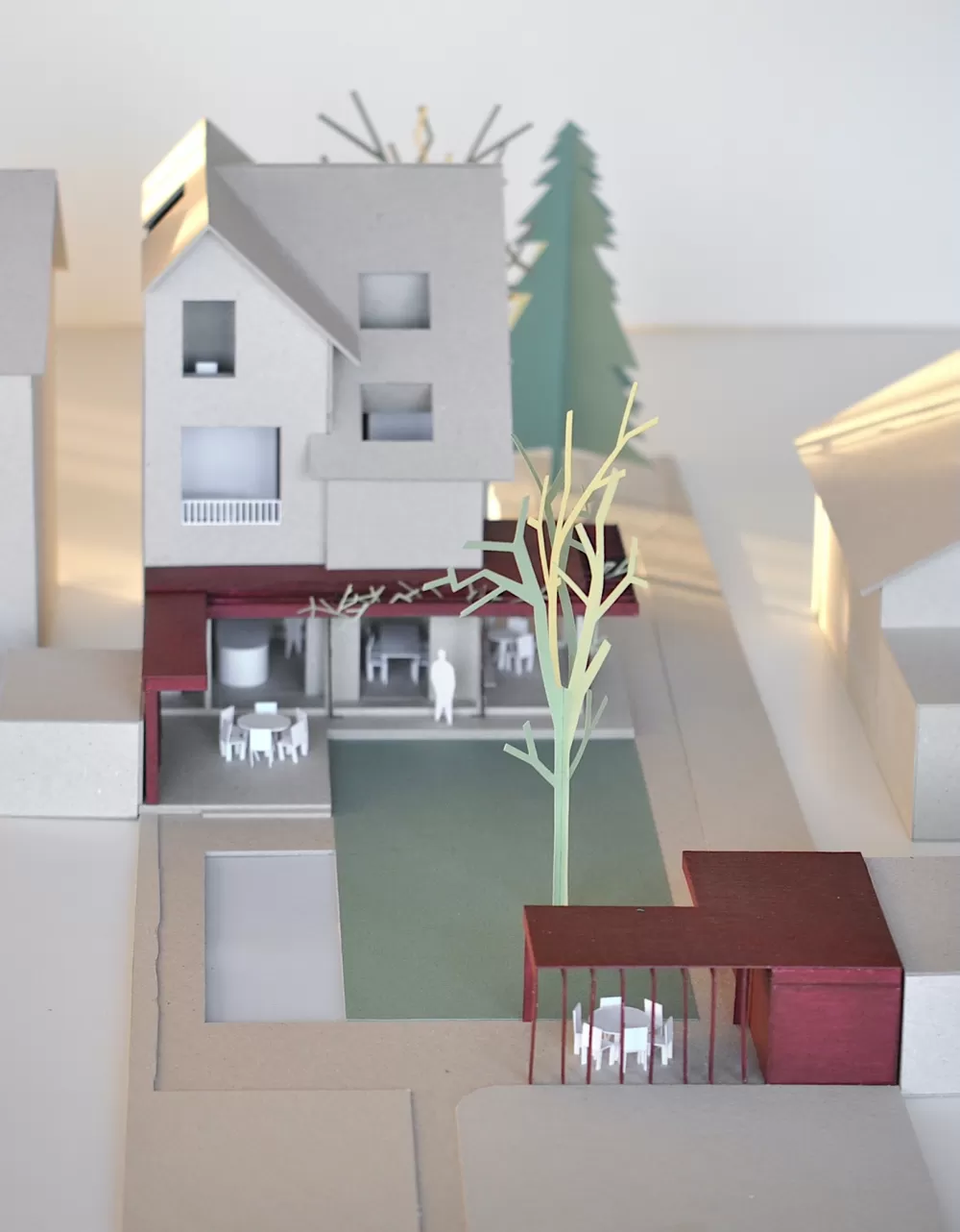 De bestaande woning vormt samen met de buurwoning een bijzonder mooi beeld in de straat. De woning is echter in slechte bouwkundige staat en is ongelukkig ingedeeld: Een verhoogd leefniveau met verschillende aanbouwsels oogt donker en ontbreekt een goede relatie met de tuin. De trap is overmaats, de ruimtes zijn slecht georiënteerd en de vrije hoogte van de ruimtes onder het dak is erg beperkt. De renovatie behoudt de kamerstructuur en het beeld van het hoofdvolume, maar door een nieuwe positie van de trap met aangepaste vloerniveaus aan de tuinzijde, ontstaat er een nieuwe planindeling die meer ruimtelijkheid en daglicht genereert. De aanbouwsels worden vervangen door een beglaasde gevel onder een houten luifel die de binnenruimte vergroot en aan de zuidzijde een wintertuin vormt. Samen met een nieuwe tuinberging omkadert de nieuwe luifel een centrale verblijfsplek in de tuin en worden de aanwezige scheimuren in de tuin netjes afgebouwd. Beide nieuwe constructies worden opgebouwd uit geritmeerde houten balken en kolommen in een rode tint. De allure van de fraaie voorgevel wordt versterkt met het vrijmaken van een inpandige toegang, het verwijderen van een beeldverstorende erker en het opwaarderen van de waardevolle, bestaande elementen. De woning wordt duurzaam geïsoleerd met biologische materialen, goed geventileerd met een balansventilatie en verwarmd met een geothermische warmtepomp.
